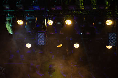 Stage lights on concert. Lighting equipment with multicolored beams.