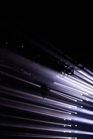 Abstract defocused composition with stage light during a music concert. Bright beams of searchlights in the dark. Blur, noise, soft focus.