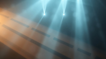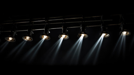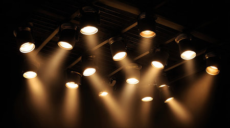 A dynamic array of stage lights casts warm beams in a dark environment, enhancing visual depth and creating an engaging atmosphere for performances.