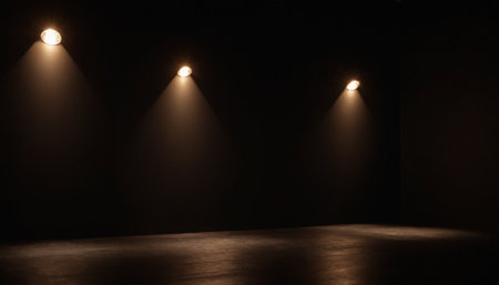 A dark, empty studio space with two bright spotlights casting warm light beams onto the floor, creating a dramatic and focused atmosphere.
