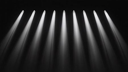 A row of evenly spaced spotlights shining upward, creating symmetrical beams against a dark backdrop