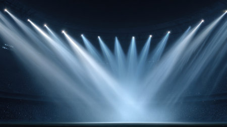 A captivating visual of an empty arena lit by strong beams of light, setting an inviting atmosphere for future events, performances, or concerts in a contemporary space.