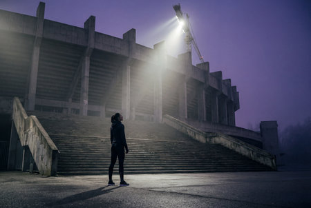 A determined female athlete stands alone at the base of massive concrete stairs leading to a stadium illuminated by a dramatic bright spotlight beaming through the misty night air.