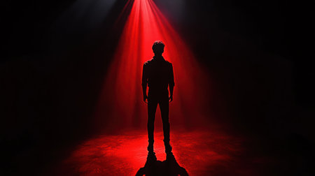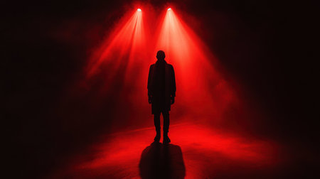 In a dimly lit space, a single figure is highlighted by intense red lights, casting long shadows and evoking feelings of dread.