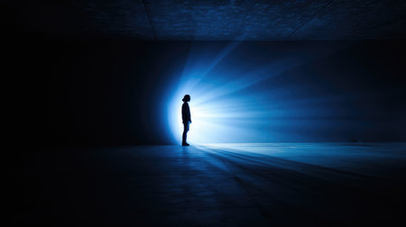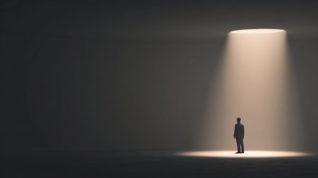 A solitary figure stands in a dark environment, illuminated by a focused beam of light, evoking themes of hope, isolation, and existential reflection.