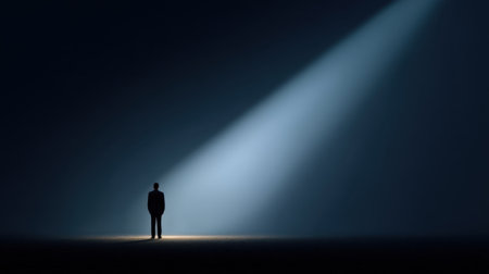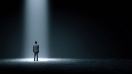 A business person stands under a spotlight in a dark space, looking contemplative and facing the fear of failure with strong emotions.