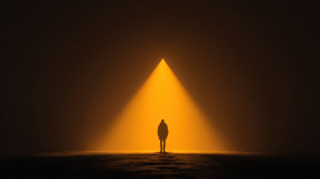 Solitary figure stands dimly lit environment, illuminated by striking beam of warm orange light. scene evokes sense of mystery and introspection, highlighting contrast between light and darkness
