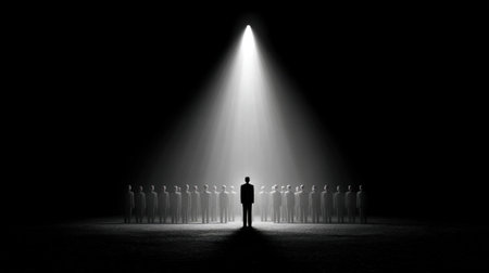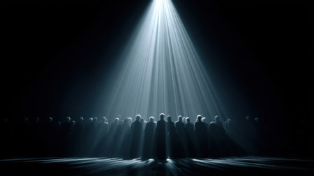 This striking image captures a group of silhouetted figures standing in a dark space, illuminated by a bright spotlight. The composition evokes themes of unity and confrontation in an abstract narrative.