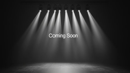 coming soon text under spotlight, dark background. anticipation and reveal concept