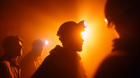 Miners working together in a dimly lit environment with headlamps