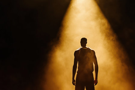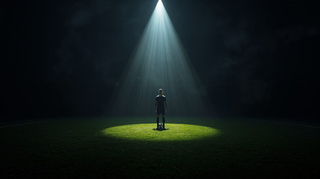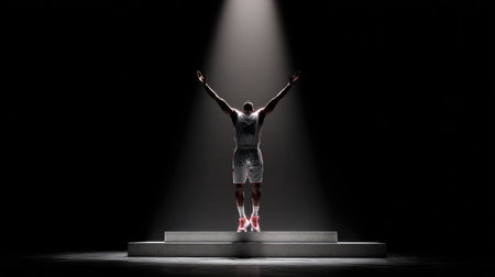 A striking image of an athlete in a spotlight, celebrating a moment of achievement and triumph. The dramatic lighting enhances the emotion and focus on success.