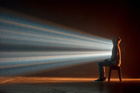 A person sitting in a dark room with radiant light beams emerging from their face
