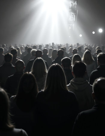 A large crowd stands under a dramatic light, casting silhouettes and creating a sense of anticipation and mystery. the focused illumination highlights the diverse gathering, suggesting themes of unity and exploration.