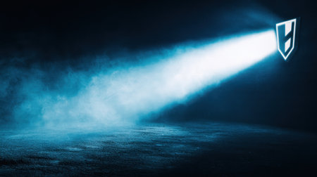 A captivating blue light beam cuts through a dark, foggy atmosphere, creating a sense of mystery and drama. The shield symbol enhances the visual impact.