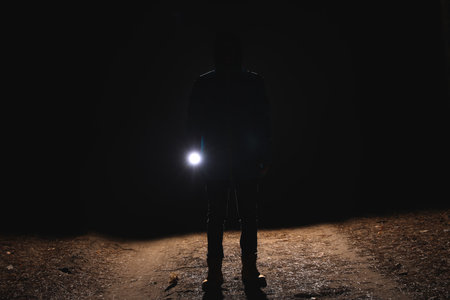Silhouette of man with bright flashlight in forest at night