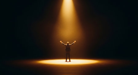 Silhouette of a singer in the spotlight, arms wide open, with stage lights creating a powerful and emotional scene