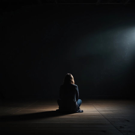 A woman sits alone in a dark room, illuminated by a single spotlight, creating a dramatic and introspective atmosphere