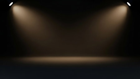 A dark, empty studio space with two bright spotlights casting warm light beams onto the floor, creating a dramatic and focused atmosphere.
