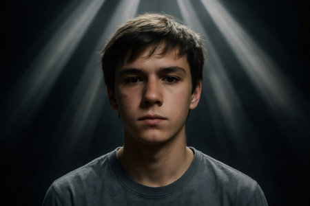 Dramatic portrait of a young man illuminated by light rays coming from above in a studio setting, creating a mysterious and intense atmosphere