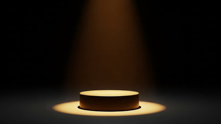 A circular podium on a dark stage is bathed in warm, orange light, with visible dust particles in the beam.