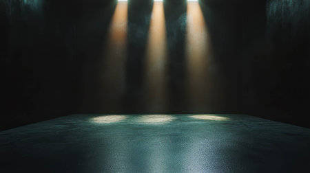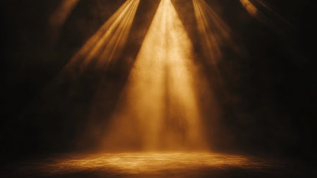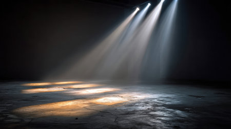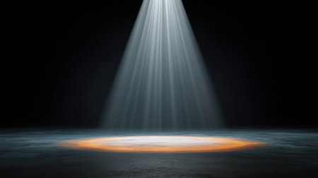 Dramatic stage scene featuring bright spotlights illuminating circular area on dark background, creating atmosphere of anticipation and excitement. soft haze adds depth and intrigue to setting