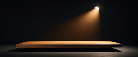 A wooden platform is illuminated by a spotlight against a dark background, ideal for product display, showcase, or presentation the stage is minimal, clean.