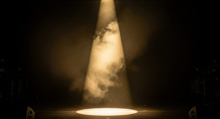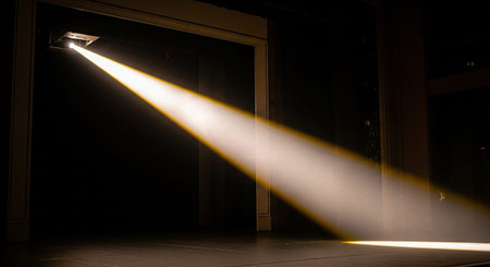 Spotlight beam illuminating dark stage, moody atmosphere. Theater lighting and performance concept