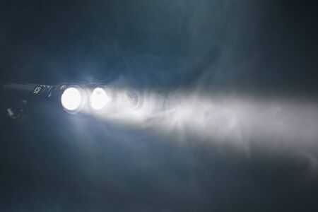 The light is out of focus. Beautiful background with light in the foreground. theater spot lights on black curtain with smoke. Lighting equipment.