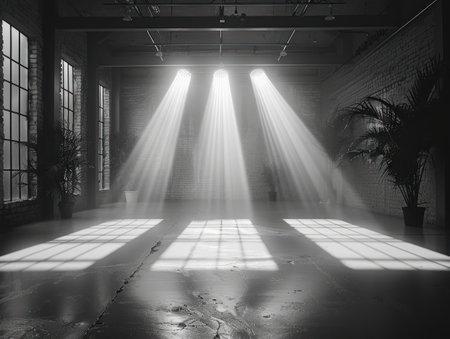 This image features dramatic stage lighting with bright rays illuminating an empty floor in a darkened industrial setting, creating a striking visual atmosphere.