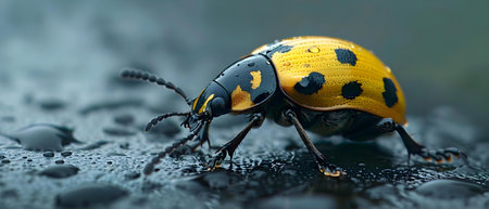 A vibrant beetle with yellow and blue colors is walking on a soft pastel surface, showcasing its distinct spots and striking features.