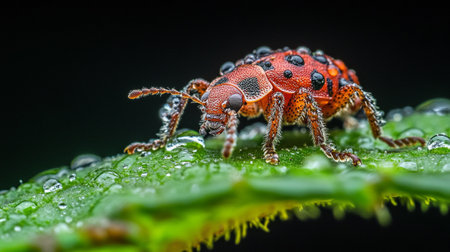 A vivid close-up of a colorful beetle resting on a leaf adorned with glistening water droplets, showcasing the intricate details of nature's beauty and moisture.