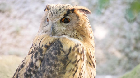 Eurasian eagle-owl (Bubo bubo), head close-up. Natural environment. Portrait art. Wildlife, nature, birds, ornithology, biology, zoology, science, education, graphic resources