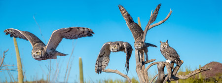 Great Horned Owl in Sonoran Desert Daytime Flying Sequence