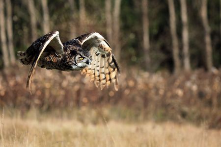 Beautiful image of European Eagle Owl in flight bubo bubo