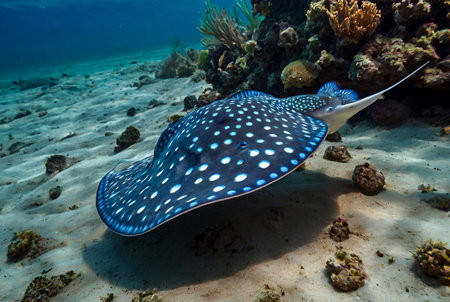 Blue spotted stingray (Myliobatoidei) cartilaginous fish on sandy bottom in tropical underwaters. Skate in underwater wild animal world. Observation of ocean wildlife. Scuba diving in Ecuador coast