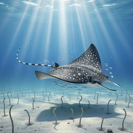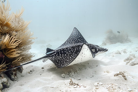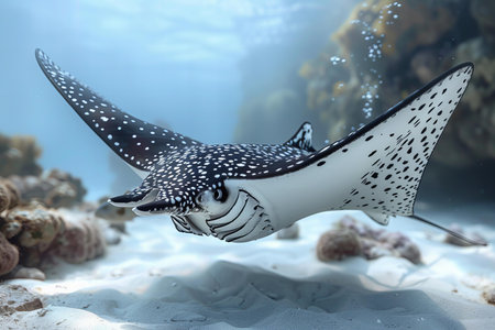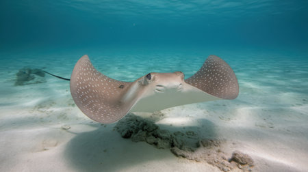 Spotted eagle ray swims gracefully over sandy ocean floor