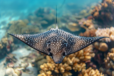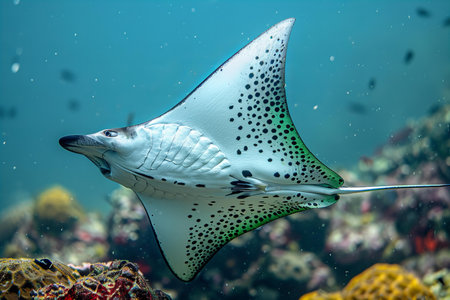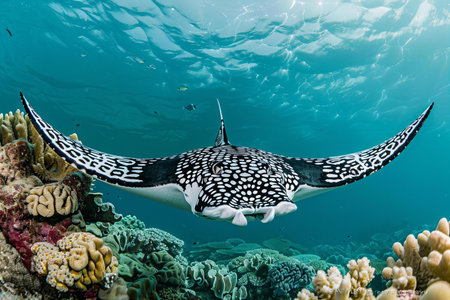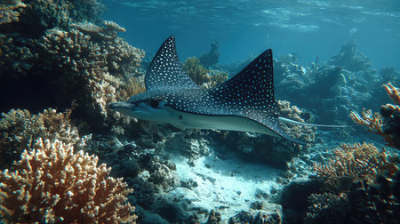 A stunning spotted eagle ray swims gracefully through a colorful coral reef, showcasing the beauty of underwater life in clear ocean waters.