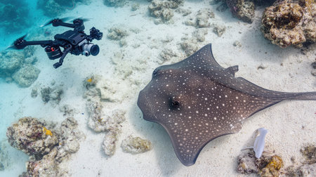 An underwater drone hovers near a majestic stingray on a sandy ocean floor, showcasing the beauty of marine life in its natural habitat.