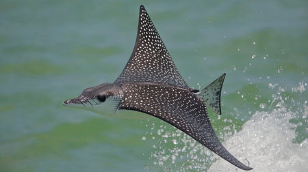 A stunning spotted eagle ray gracefully leaps from the ocean's surface, showcasing its vibrant patterns against the blue water. Perfect for wildlife enthusiasts.