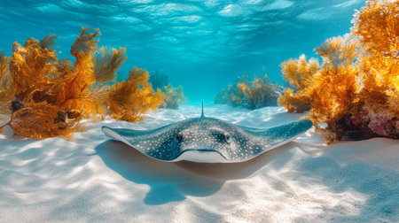A stingray moves gracefully across a sandy seafloor, surrounded by vibrant corals and seaweed in clear blue waters. Sunlight filters down, creating a serene underwater atmosphere.