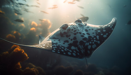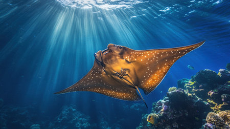 Close-up of a stingray gracefully gliding on the ocean floor, surrounded by colorful coral reefs. Sunlight creates a mesmerizing ray of light, illuminating the beauty of the underwater world.