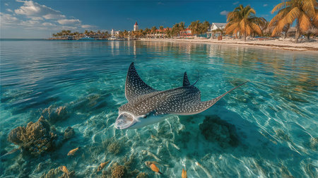A majestic spotted eagle ray glides gracefully over a pristine white sandy seabed, bathed in tranquil turquoise waters. Its spotted pattern contrasts beautifully with the bright sand.