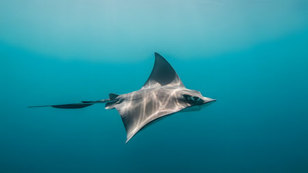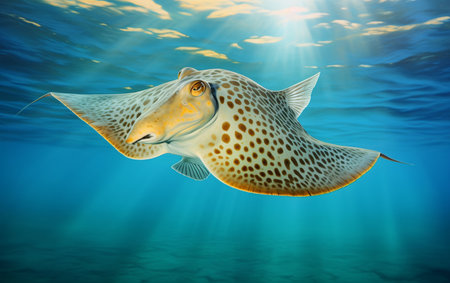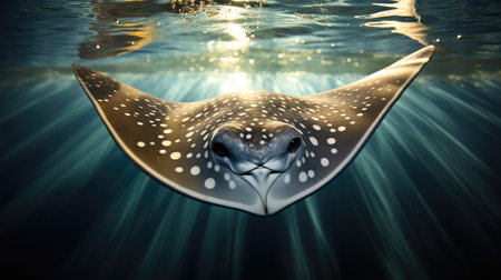 A stunning stingray navigates through crystal-clear waters, illuminated by radiant sunlight. This serene marine scene captures the beauty and elegance of underwater life.