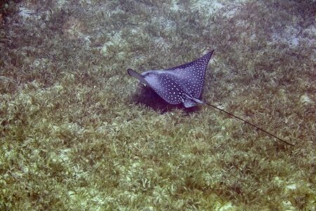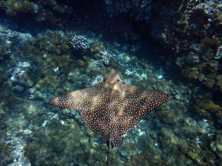 Eagle rays Myliobatidae. Common spotted bracken. Easily recognizable by white spots on a dark brown back. Reach up to 350 cm long.