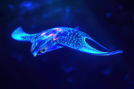 Surreal, glowing alien manta creature swims through dark ocean depths, blending science fiction with deep-sea marine mystery.