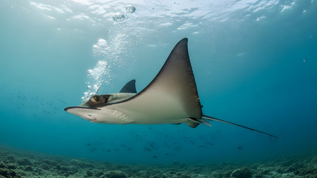 A majestic eagle ray glides through the deep blue ocean, illuminated by sunlight from above. Rising bubbles add dynamic movement to the scene as the ray navigates the clear underwater environment.