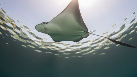 An eagle ray swims overhead, captured from a low angle against the bright surface of the water. The sunlight filters through, highlighting the ray's distinct shape and the peaceful blue underwater atmosphere.