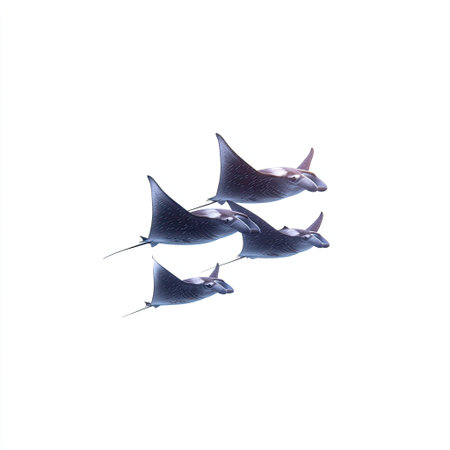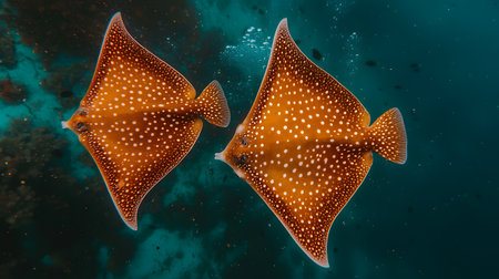 a school of rays swimming together, their flat bodies and flowing tails creating a mesmerizing display, created with generative ai