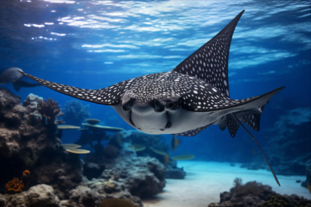 An impressive stingray gracefully swims near the surface of the ocean, its reflection mirroring on the water. Surrounded by other small fishes and a vibrant coral reef, this underwater scene is truly captivating. The stingray's smooth movement and the play of light create a peaceful underwater environment.