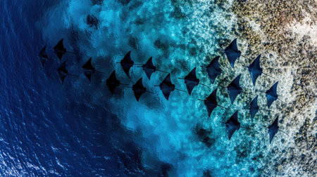 school of rays swimming in synchronous formation, their delicate fins and tails shimmering, created with generative ai